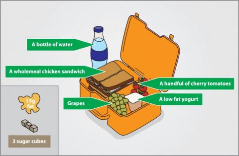 “An alternative lunchbox could contain a wholemeal chicken sandwich, a handful of cherry tomatoes, a low fat fruit yogurt, a bunch of grapes and a bottle of water, which provides half the amount of fat compared with the other lunchbox, at 13g, and just 9g sugar, equal to three sugar cubes.