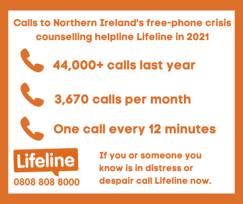 Lifeline, Northern Ireland’s free-phone crisis counselling helpline, received over 44,000 calls in 2021, with approximately 3,670 calls per month - an average of one call to Lifeline every 12 minutes last year.