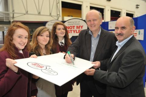 5. Pictured signing the pledge ‘Not to make fun of mental illness’ are (L-R) Mary-Kate O’Neill, St Dominic’s School for Girls, Belfast; Meabh Harper, speaking at the event about stigma and her own recovery; Laurie-Anne Bartsch, St Dominic’s; Health Minister Michael McGimpsey and Dr Edie Rooney, Chief Executive of the Public Health Agency, part funder of the schools' event at the Odyssey, 8 October. Mary-Kate and Laurie-Anne presented their prize-winning talk: ‘Youth suicide and how to get help’ at the event.
