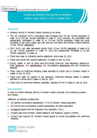 The Influenza Weekly Surveillance Bulletin is produced by the PHA and covers statistics for Northern Ireland. The bulletin is produced during the flu season. Click here to access the document.