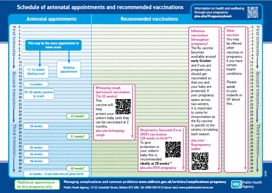 This flyer provides information on antenatal appointments and recommended vaccinations for pregnant women.