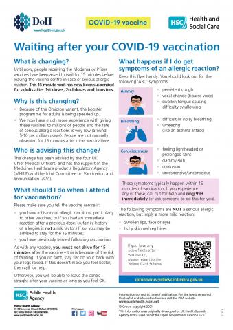 This factsheet explains why the previous 15-minute observation period following COVID-19 vaccination has been suspended and what to look out for after vaccination. You should still wait 15 minutes before driving and if you have ever experienced an allergic reaction.
